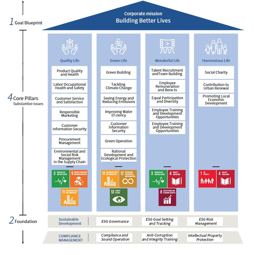 For more than two decades since the Group’s inception, we have been advocating and practicing the concept of responsible development with “2030 Sustainable Development Goals (SDG) ”of United Nations as the guiding direction. In tandem with business expansion, our attention is paid to perform environmental and social obligations and to meet our commitment to stakeholders in a concrete fashion. Equipped with ingenuity and dedication to product and service quality, we work continuously on design and technology innovation, maintain our corporate integrity and transparent culture, as well as engage in philanthropy, all in a bid to deliver on our corporate mission of “Building Better Lives”.